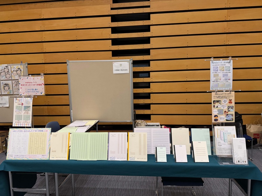 大栗紙工は「まほらノート」と「まほらゆったりつかう学習帳」の展示と試筆体験の場を作りました。
