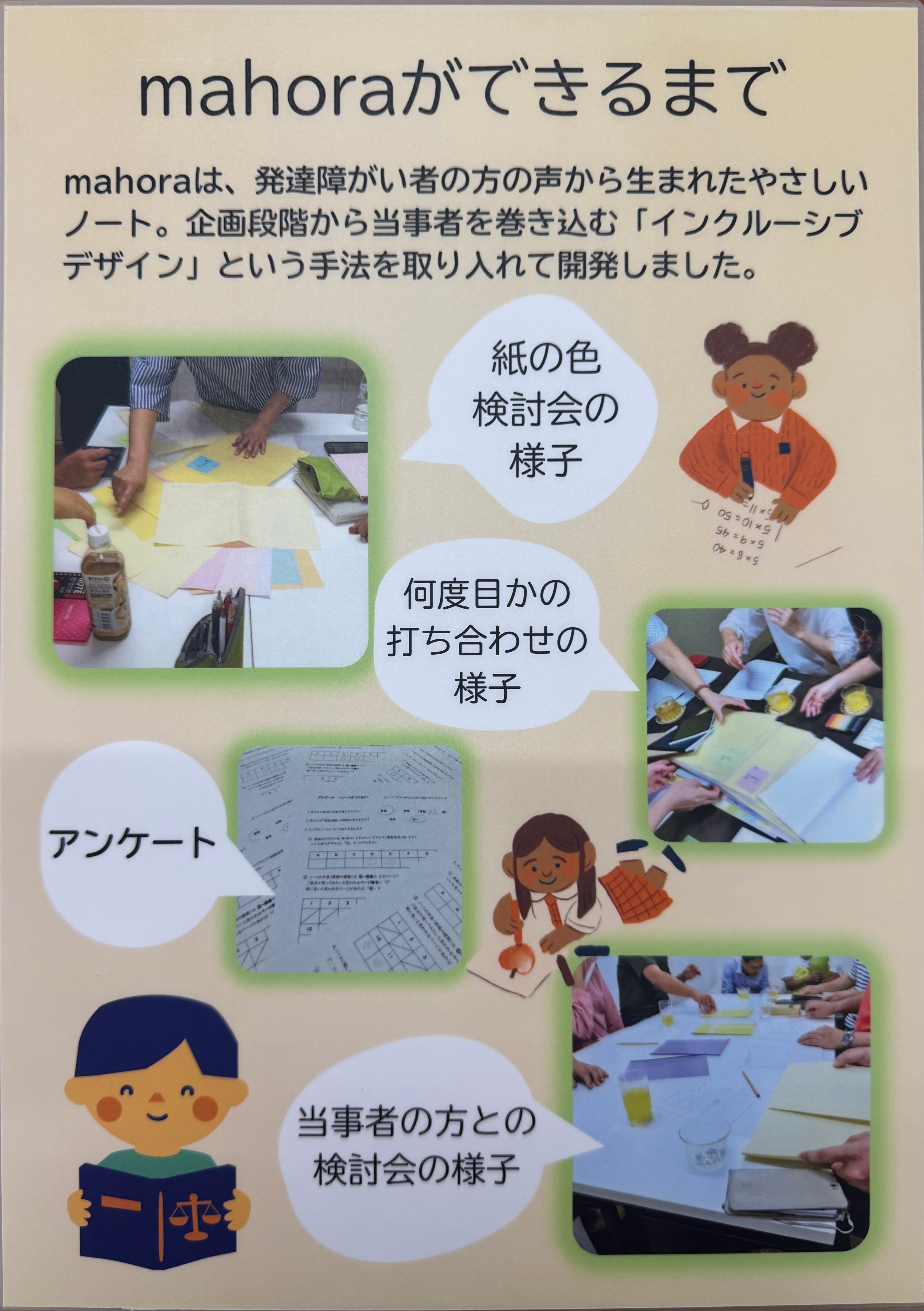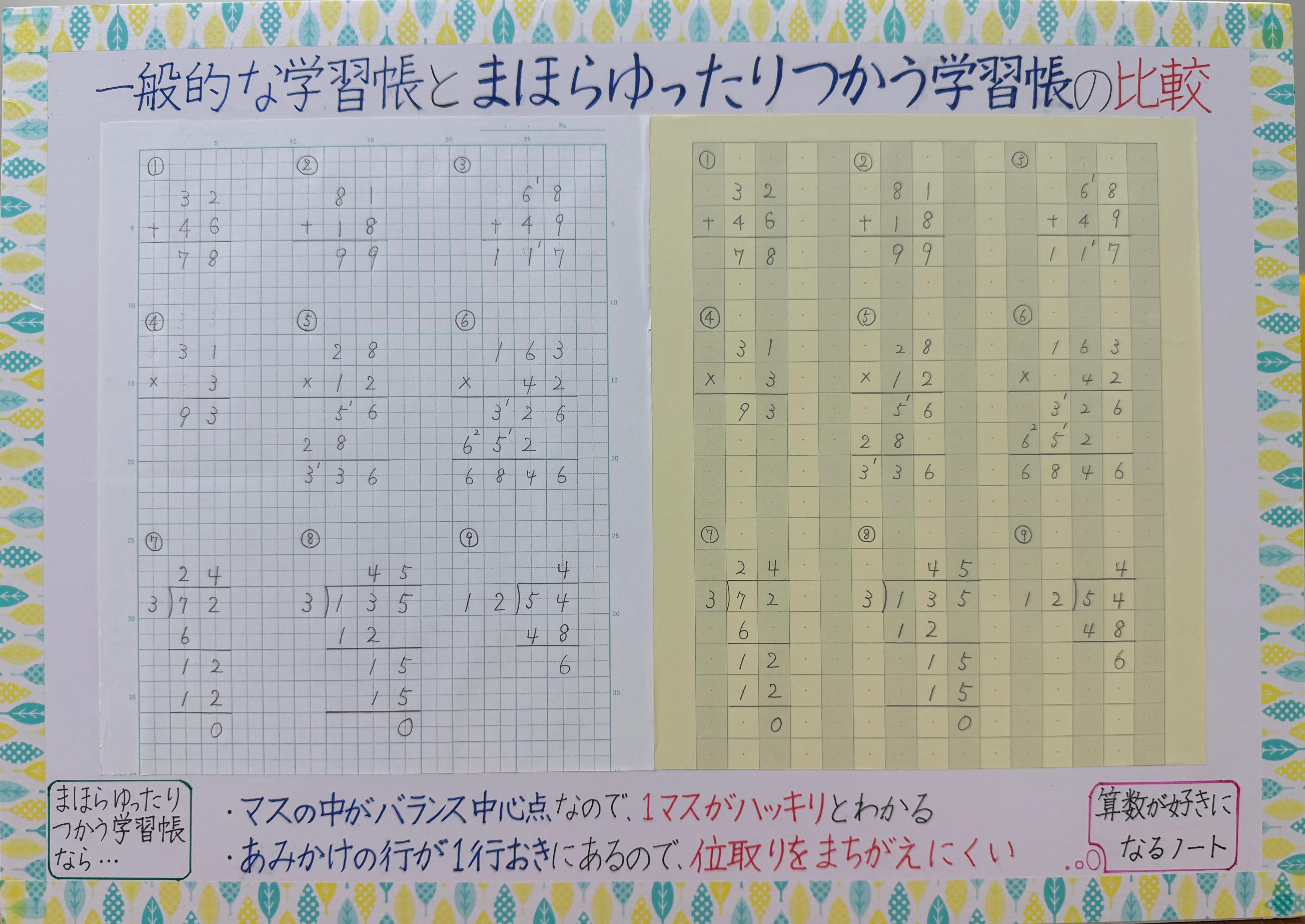 「一般的な学習帳」と「まほらゆったりつかう学習帳」で、算数のひっ算をした時の比較をしたパネルを展示しました。