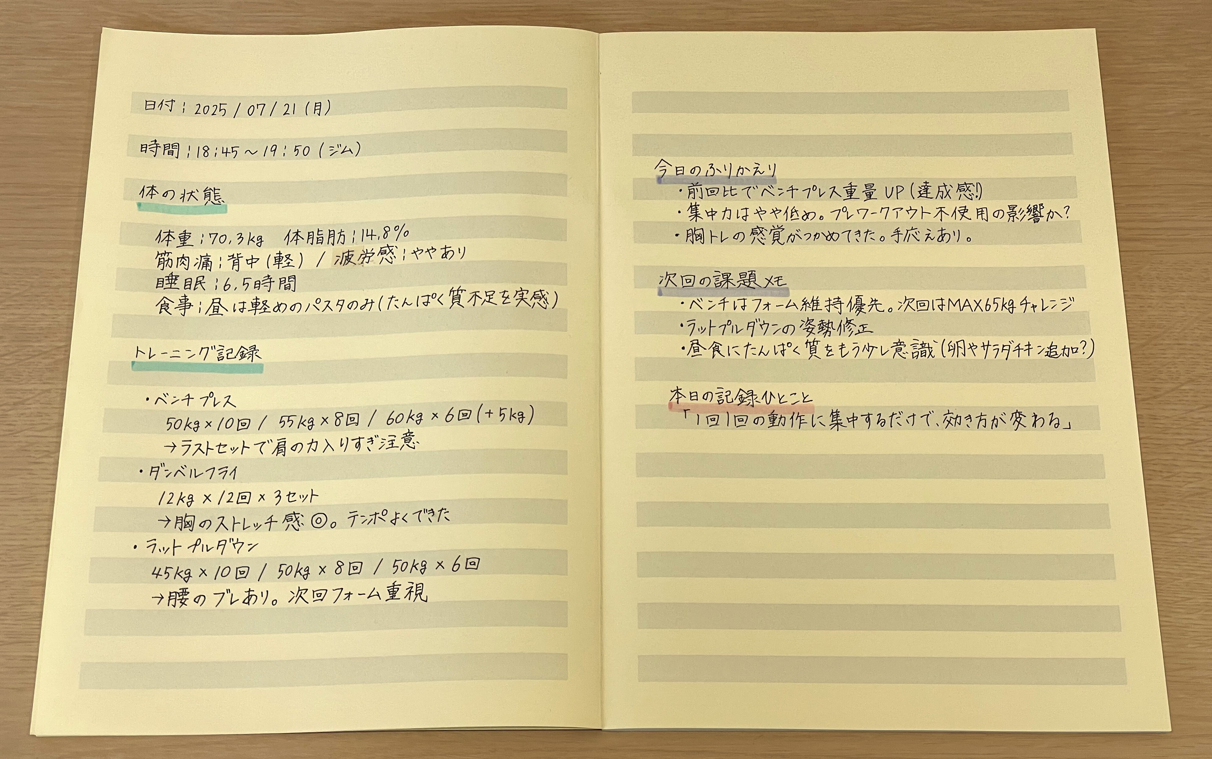 私自身は、最初はシンプルな無地ノートを使用し、後から自分なりのテンプレートを作っていきました。しばらくしてからアプリも導入し、セット数や重量はアプリに、感想や課題はノートに書くようになりました。