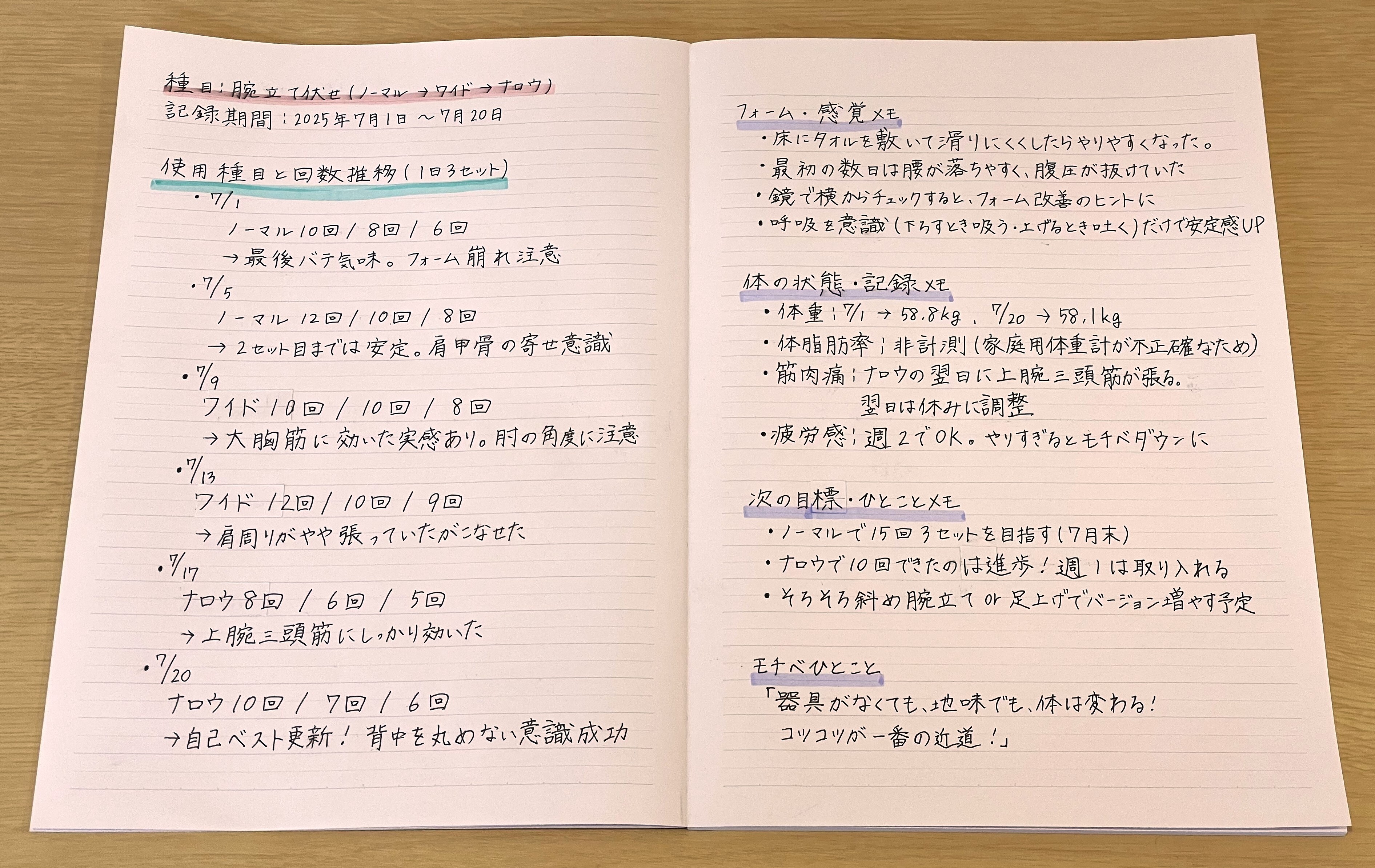 その後、トレーニングノートを書き始めたことで、少しずつ変化が目に見えるようになり、「あと5回できた」「フォームが安定してきた」といった成長が嬉しくなってきました。自分が取り組んでいることの“証拠”が、ノートという形で残っていくことは、思った以上に力になります。