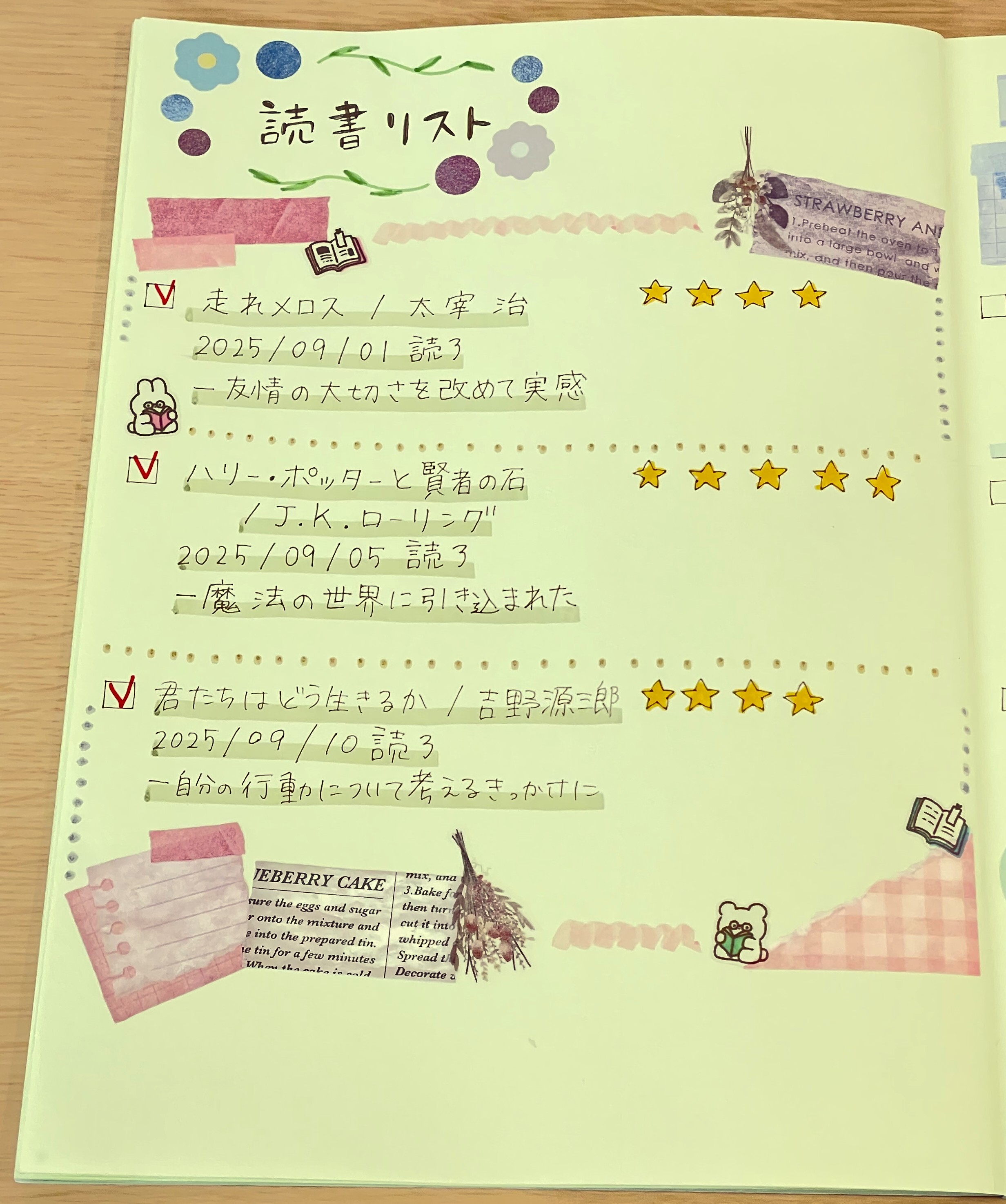 読みたい本や読んだ本のタイトルをまとめるページ。星印などで評価を書き込めば、後から振り返るのも楽しく。
