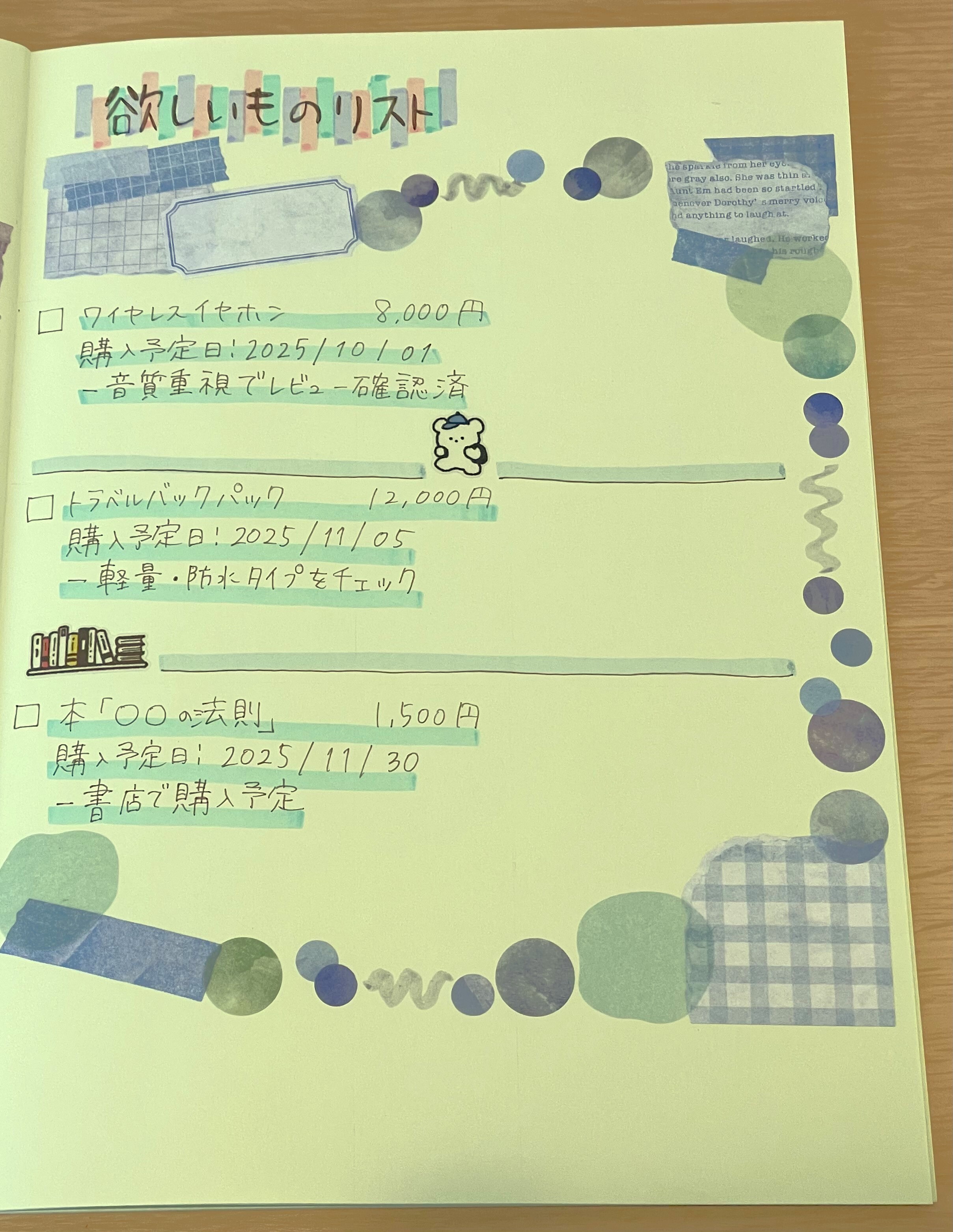 買いたいものや気になっているアイテムをメモしておくページ。衝動買いを防ぎ、計画的にお買い物ができるようになりますよ。