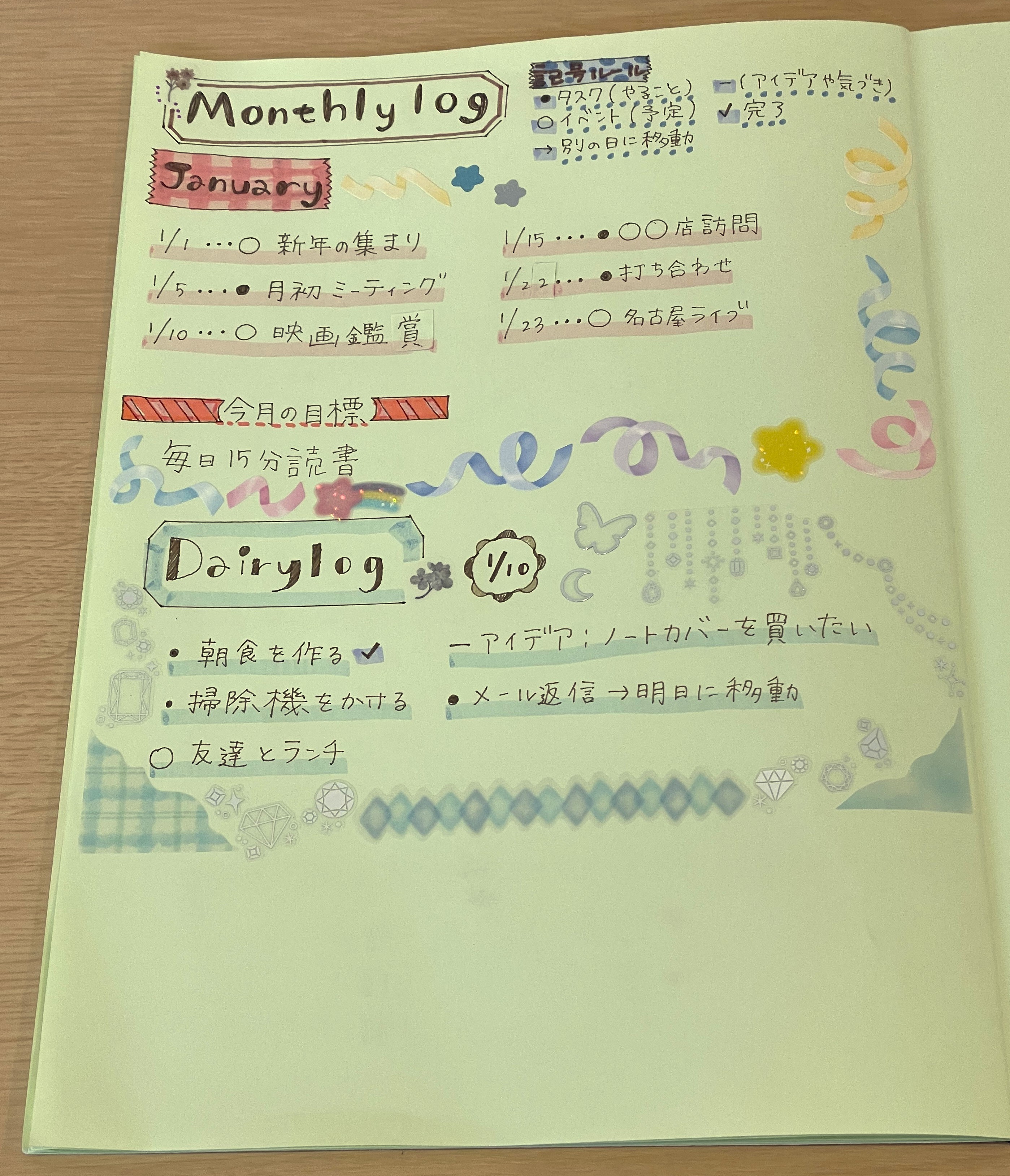 大きい文字と小さい文字を混在させたり、イラストや装飾を自由に取り入れたりできるので、自分だけのオリジナルなページを作ることも。ページごとにスタイルを変えられるため、バレットジャーナルを「自分らしく楽しみたい」人にぴったりですね。