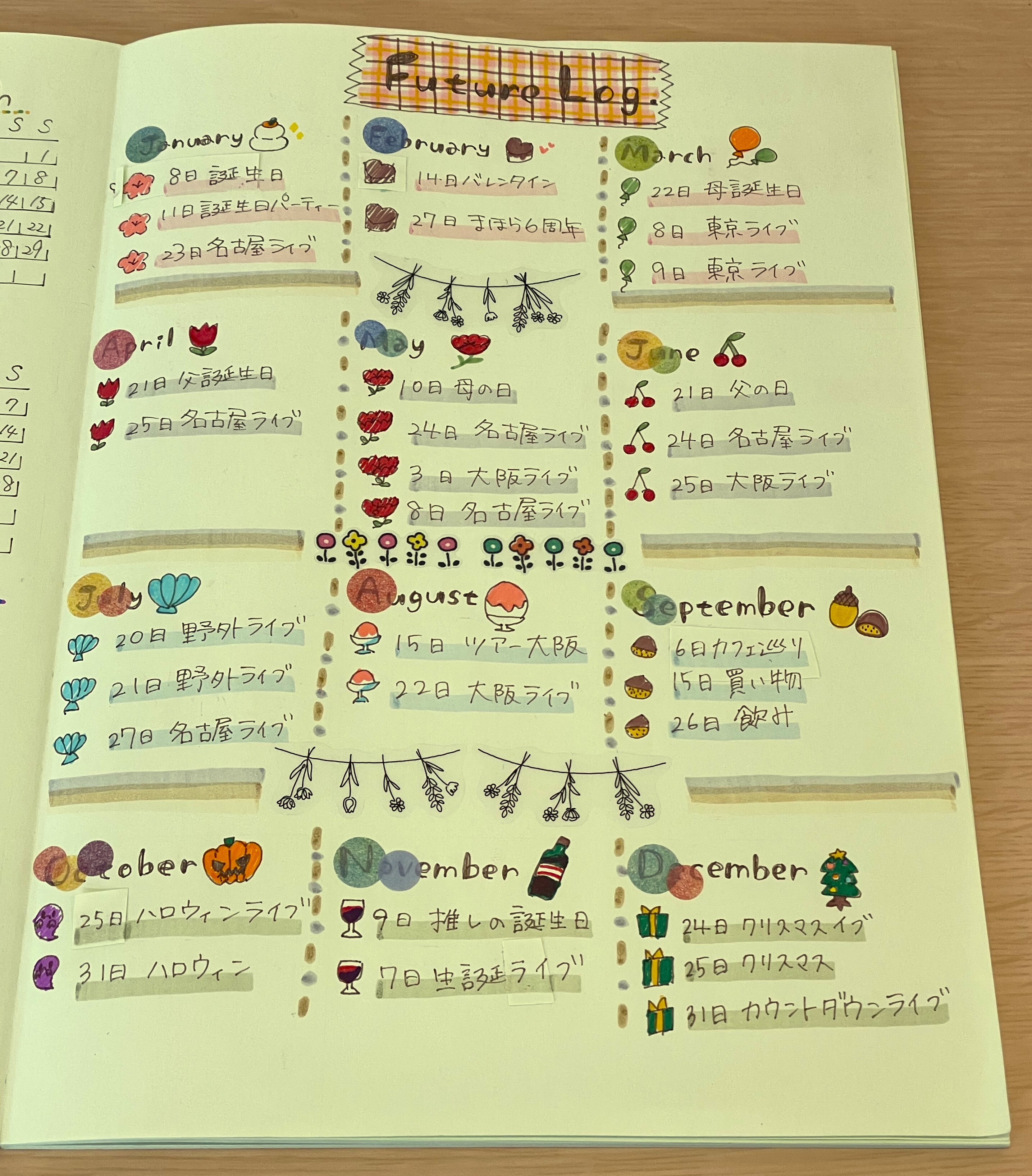 数か月先の予定をまとめるページ。年間カレンダーのように使い、誕生日や試験日、旅行の予定などを書き込んでおくと便利ですよ。