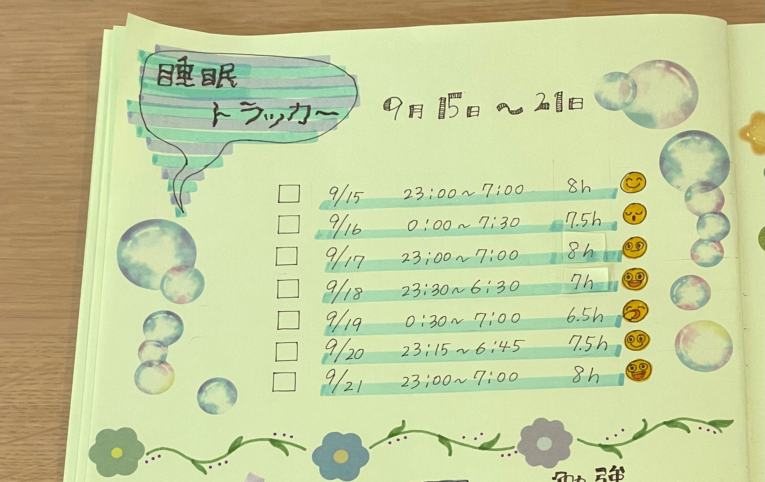 毎日の就寝時間や起床時間、睡眠時間を記録するページ。体調管理や生活リズムの改善に役立ちます。