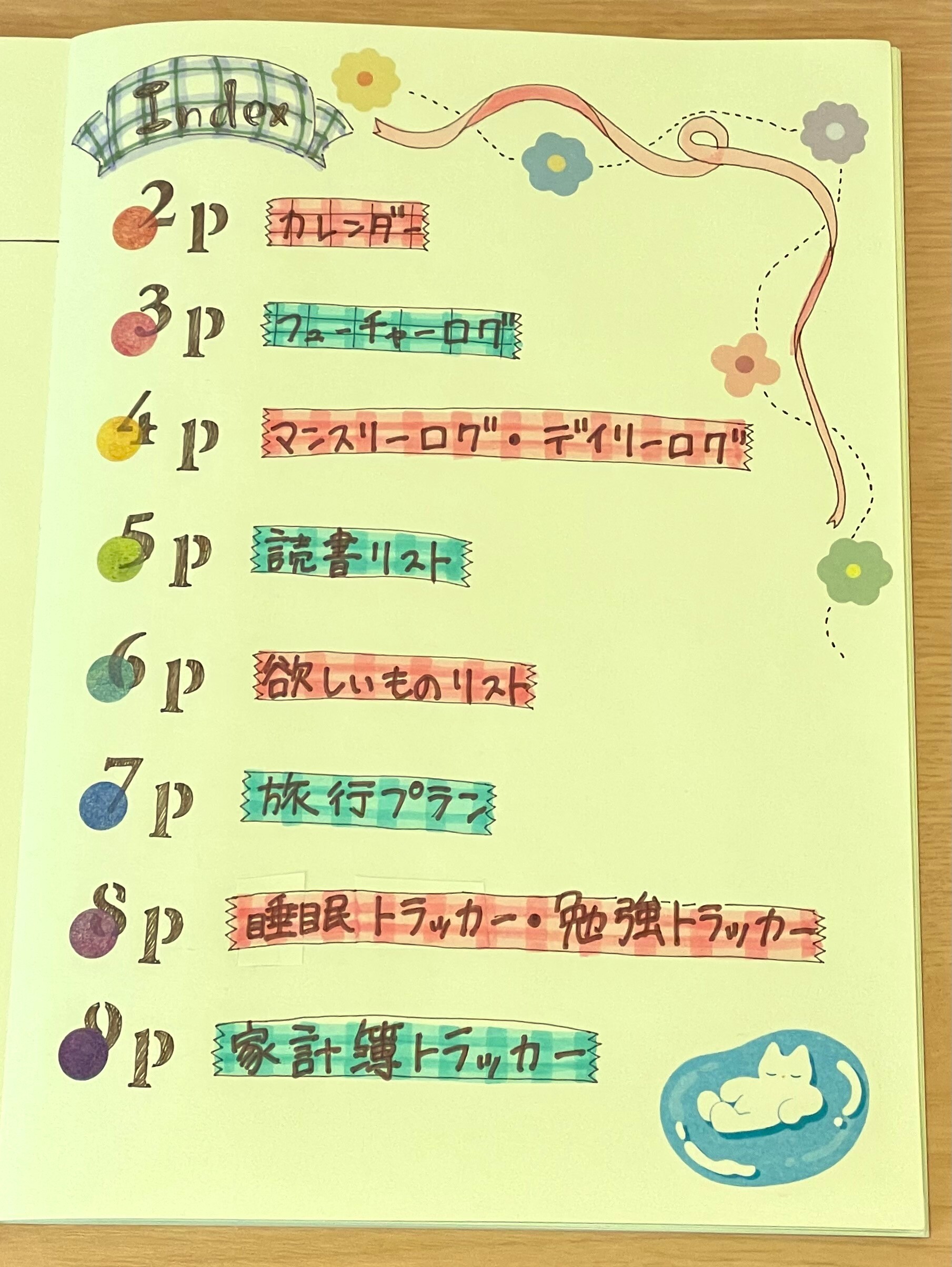 最初のページに「インデックス(目次)」を作り、どのページに何を書いたか記録しておきます。