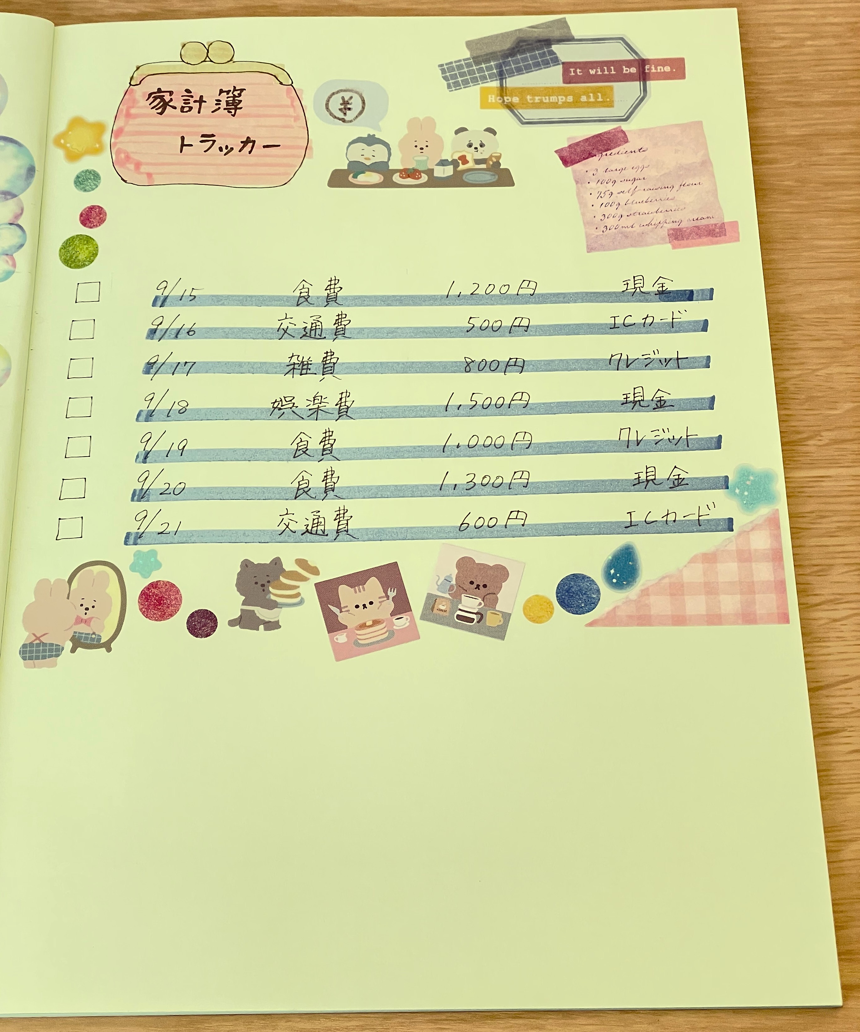 日々の支出を簡単に書き留めるページ。お金の流れを把握できるようになり、節約や予算管理のきっかけに。