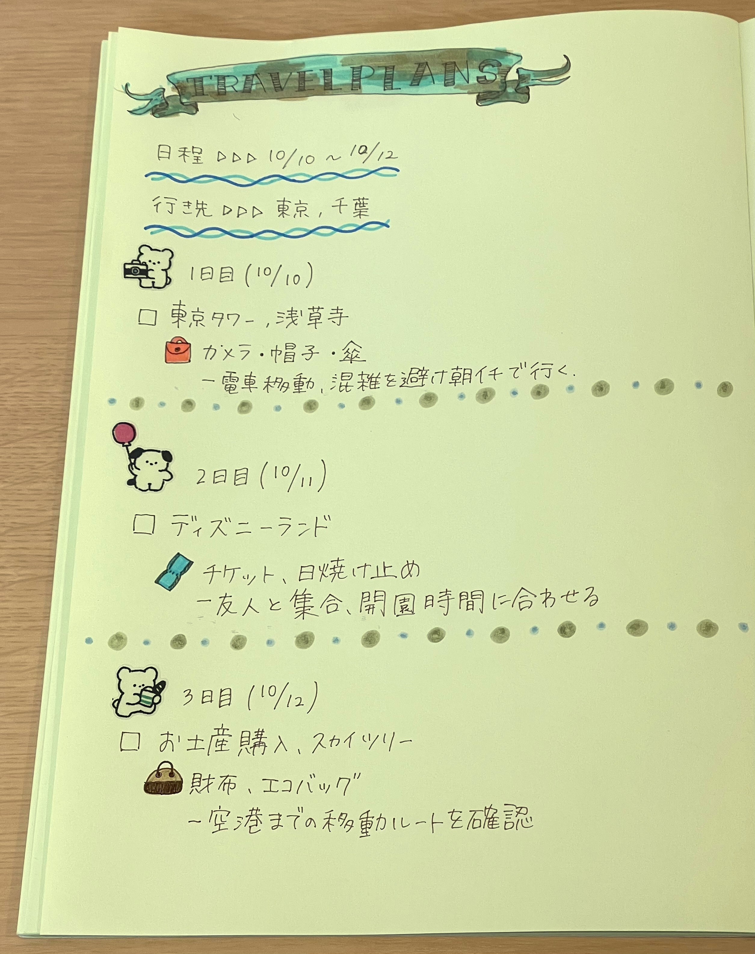 ちょっとした旅のしおりのような感覚で書くと楽しさが倍増しそうです。