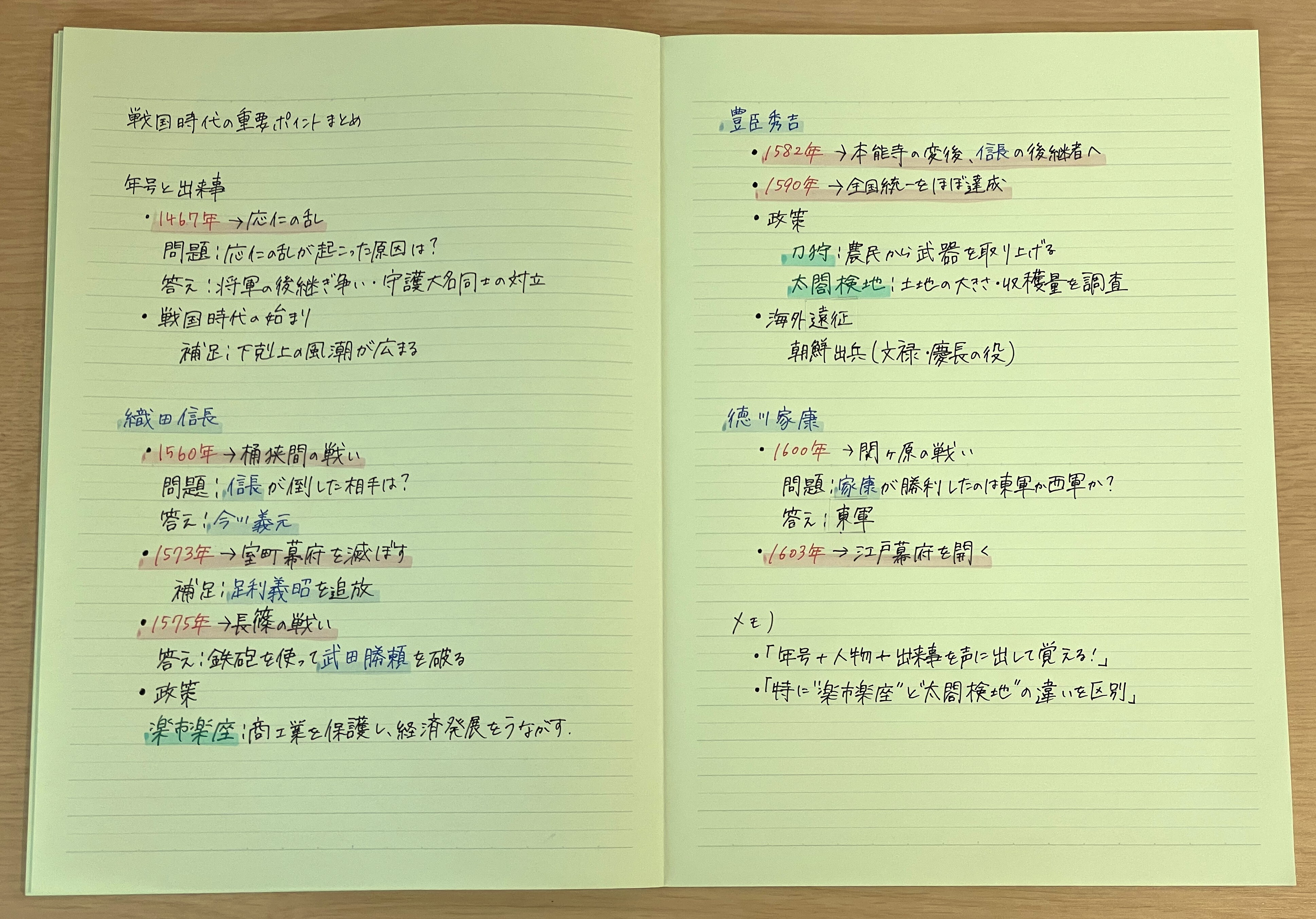 例えば歴史なら「1600年に起きた戦いは?」と問題を書き、横や裏に「関ヶ原の戦い」と答えを書いておきます。暗記カードのようにして活用できるので、スキマ時間にもぴったりです。