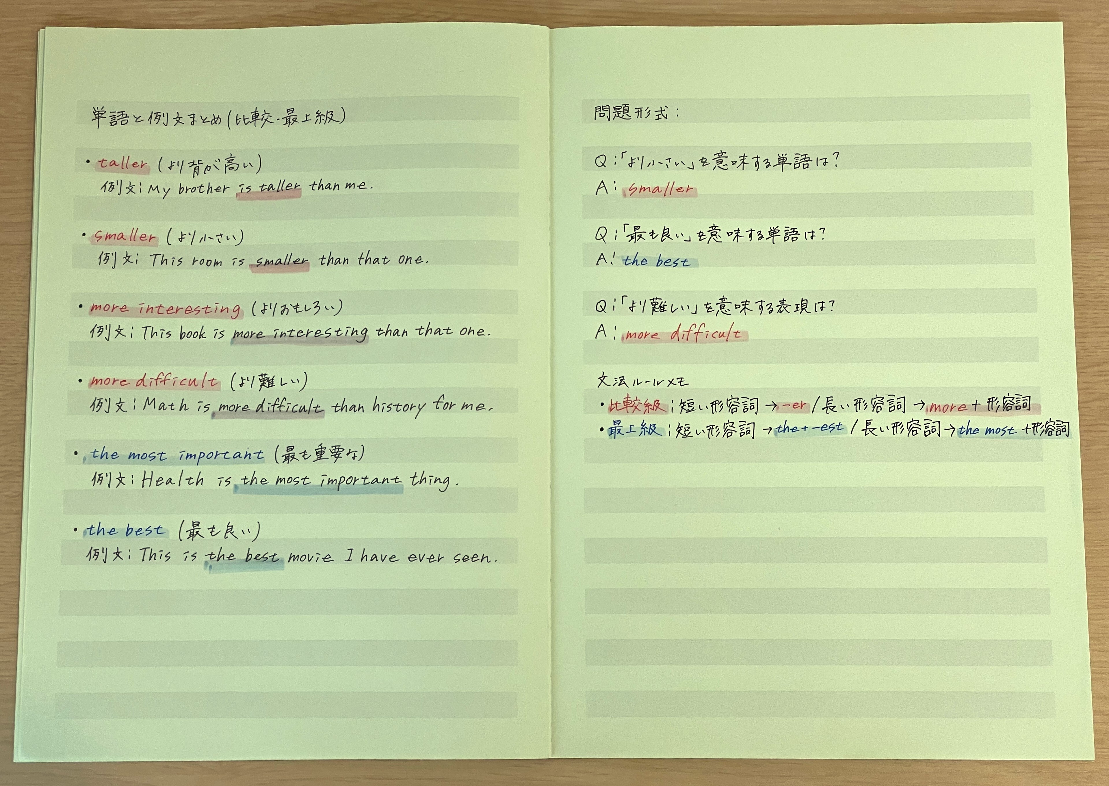 文法も同様で、ルールを書くだけではなく、自分で例文を作ってノートに残すと効果的です。私は英語の時制を学ぶときに、実際に自分の身近な出来事を例文にして書いていました。「I studied yesterday」「I am studying now」といったように。実生活と結びつけると忘れにくくなり、勉強が少し楽しくなりました。