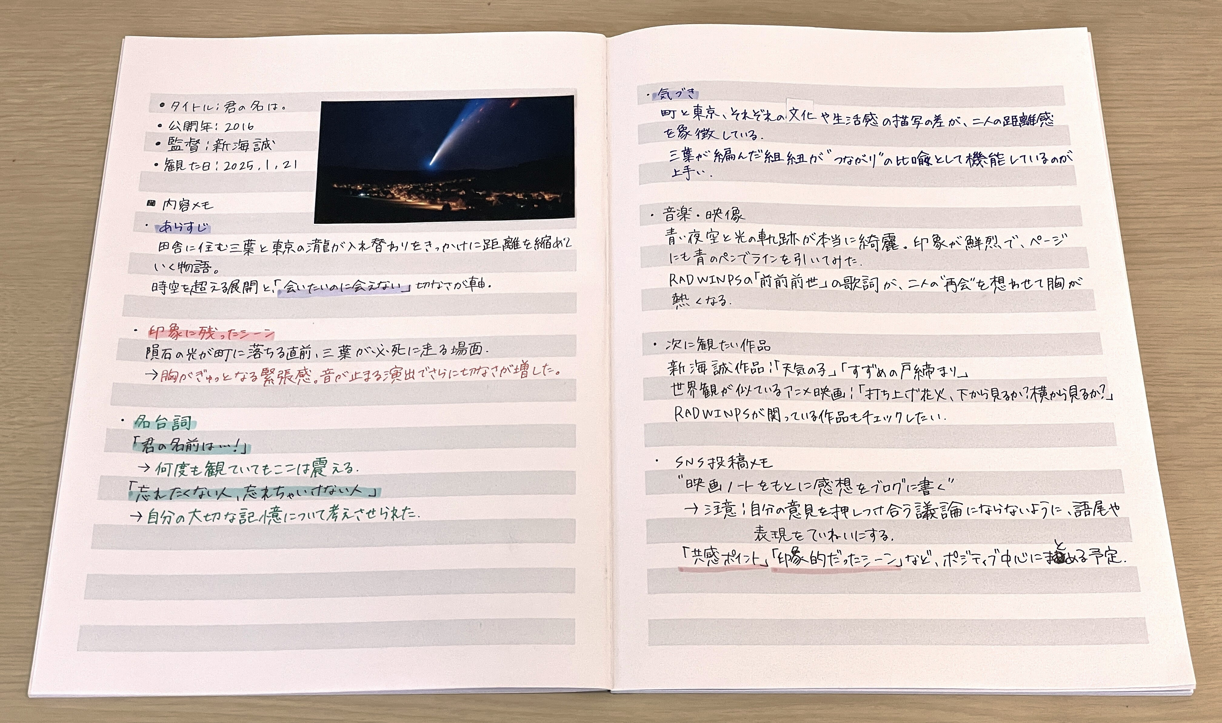 書く道具も気分を高めてくれる大切な要素です。色ペンやマーカーで感情ごとに色分けするのもいいですし、付箋やマスキングテープでスクラップ感を演出するのも楽しい工夫になります。僕はペンで色分けしてノートに書いています。また、ノートに書くタイミングも人それぞれです。観た直後の感情や気持ちを生で残すのもアリですし、時間を置いて整理してから書くのも違った気づきがあるかもしれません。