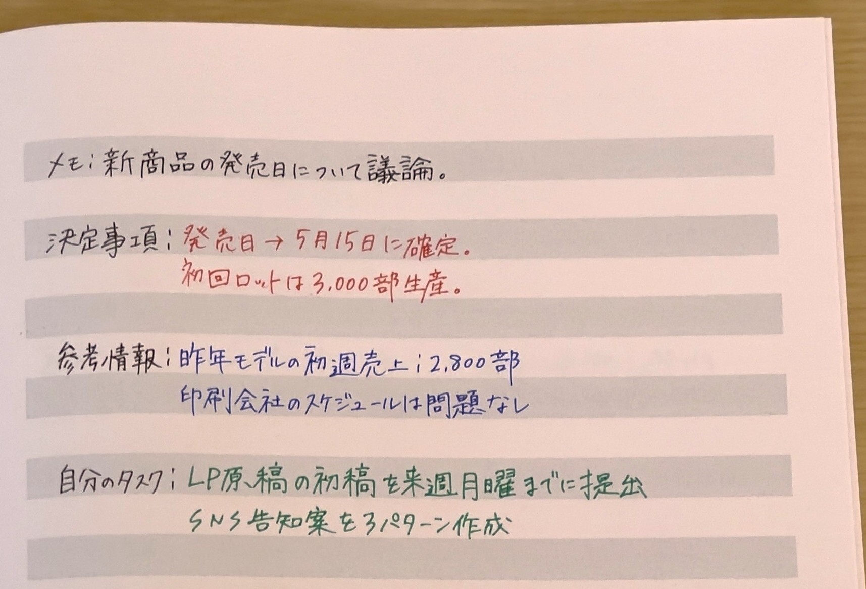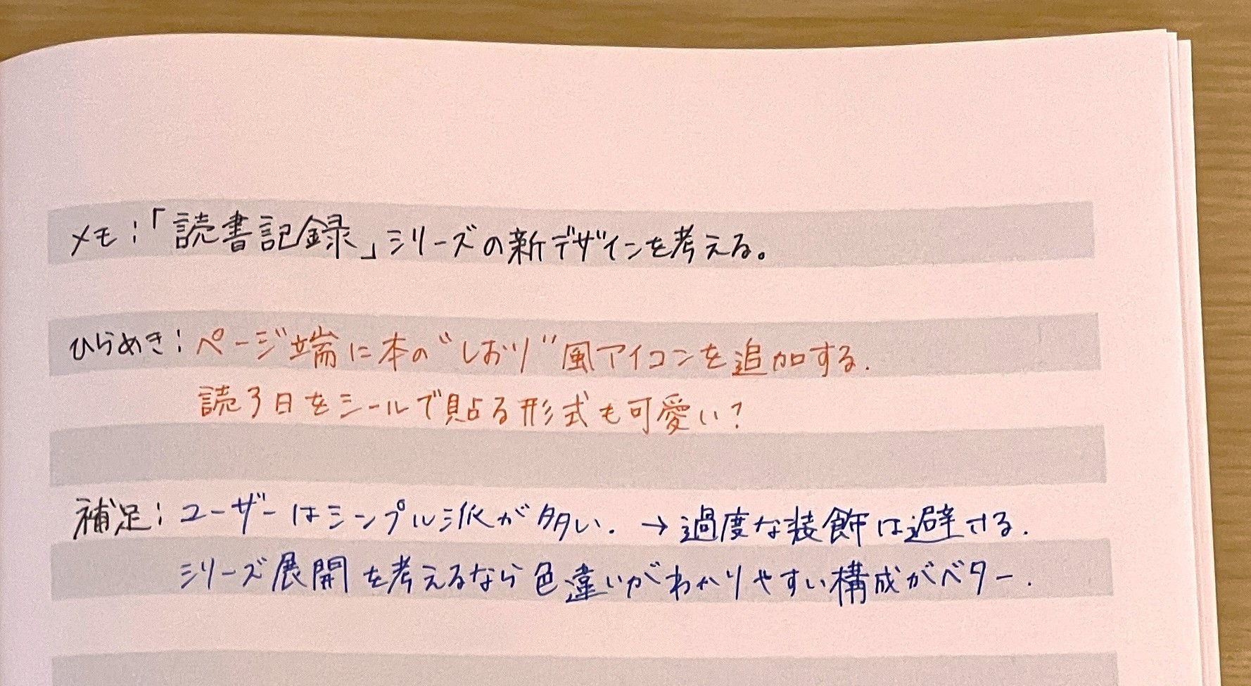 このように、あらかじめ“色の意味”を決めておけば、書くときも迷いません。