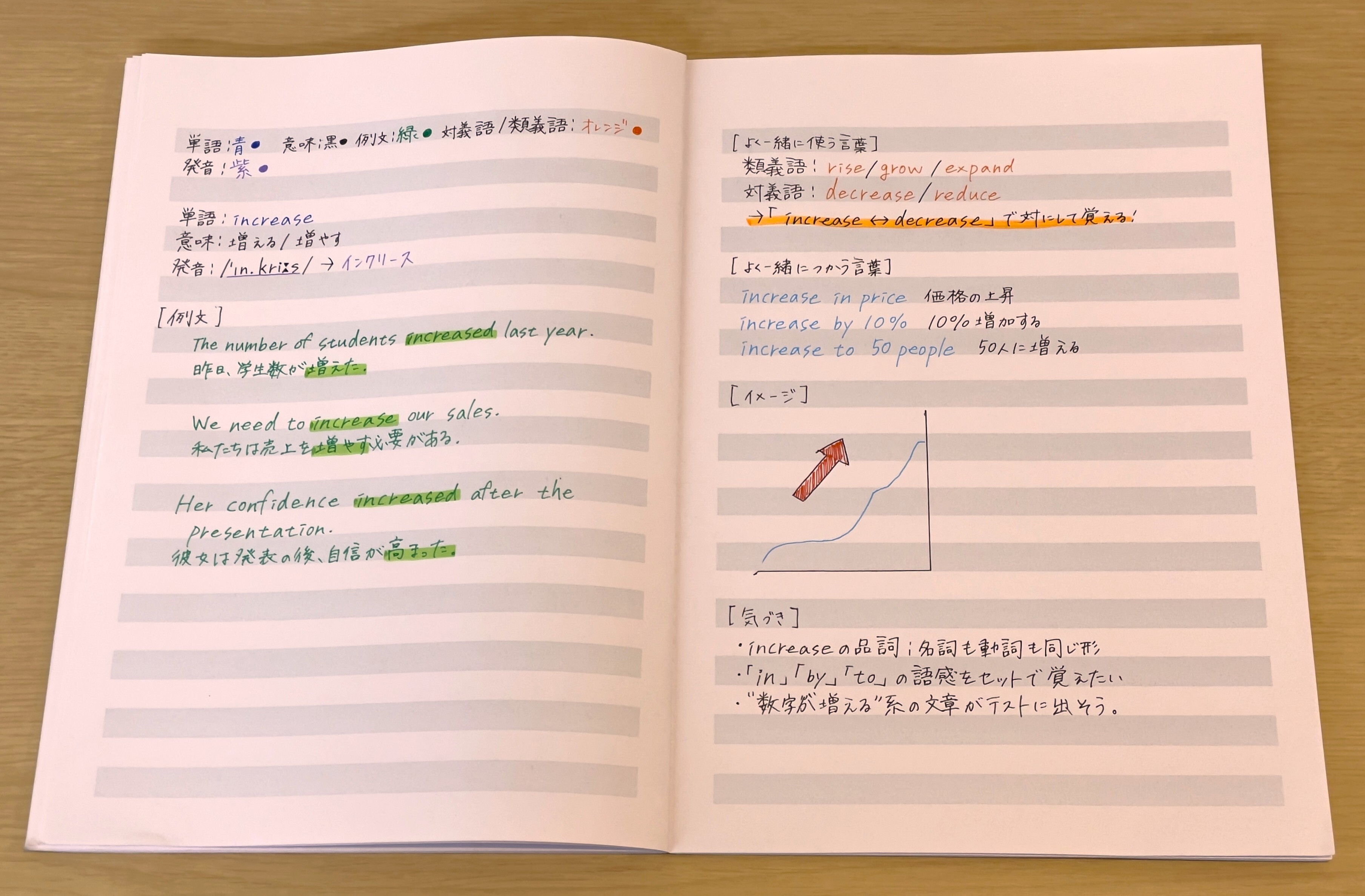 左ページに単語と意味、右ページに例文や類義語などを書くとバランスが良いでしょう。