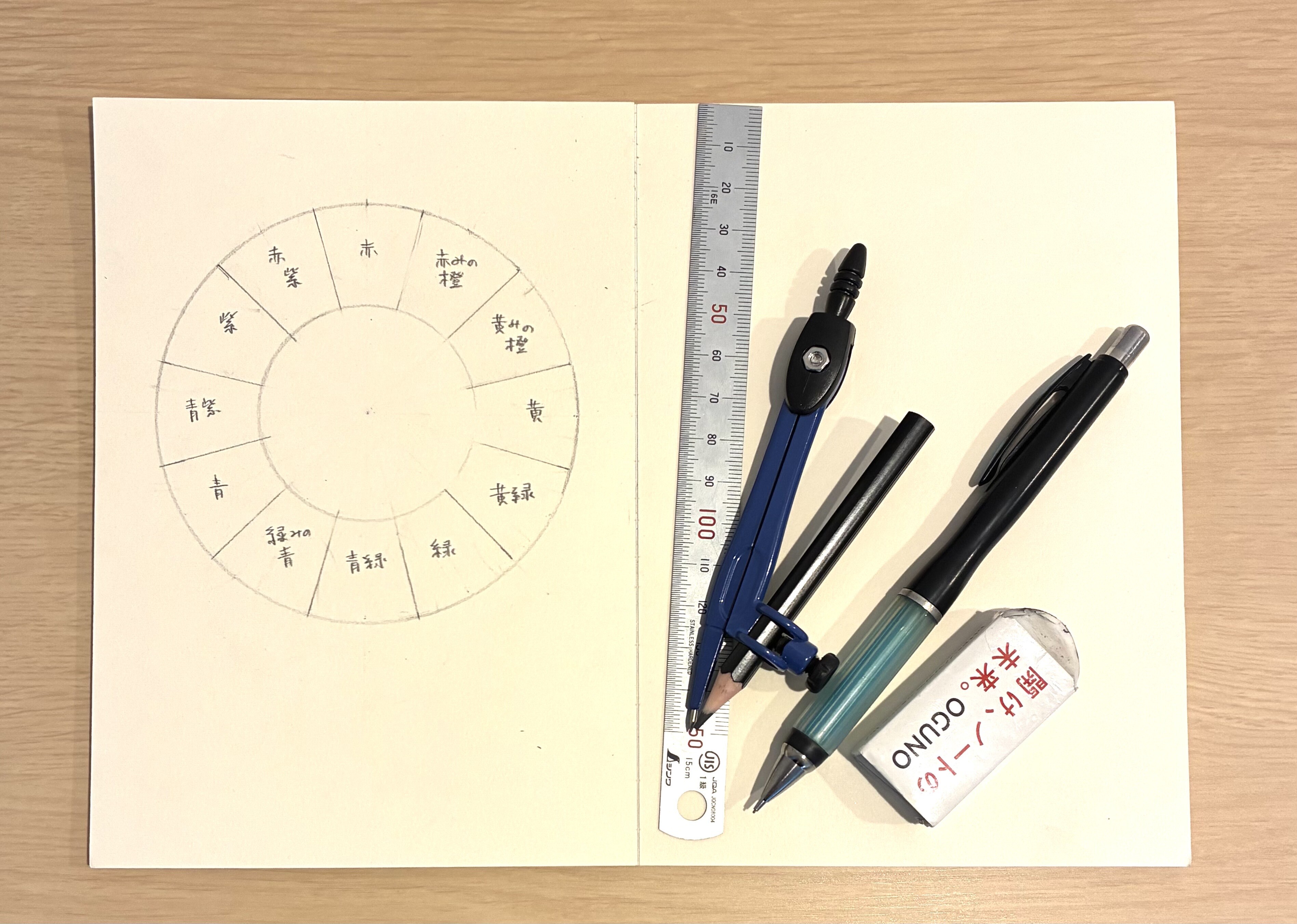 半径を決めることができます。あわせて、色相環は等分を要としています。6色・12色・24色と分ける必要があるのです。方眼・ドット方眼なら、中心点を決めて縦横斜め(45°)を引き、さらに中間を定めることで正しい等分ができます。物差しを使用して作成するより時短で作成できますね。