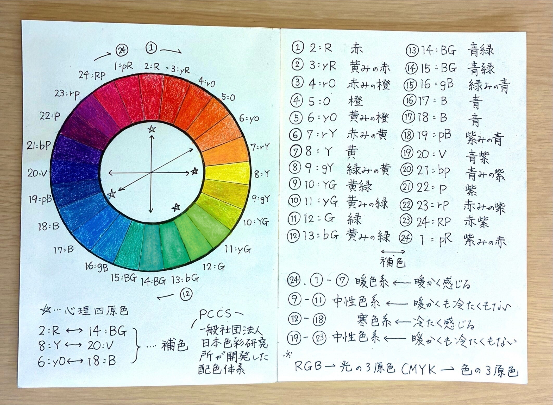 PCCS色相環は覚えると日常に役立てられる知識です。より学ぶと色彩検定の資格取得にも繋がるでしょう。しかし、色の分野の暗記は数学や科学とは違って視覚的な補助を必要とします。効率的な学びにはノートを使うのがおすすめです。見開きを活用して色への理解を深めましょう。色の分類や法則を捉えることで、配色への意識が高まるでしょう。配色はデザインや美術だけでなく、ファッションや料理の盛り付けにも役立ちます。ぜひ、今回ご紹介した暗記術を試してみてください。