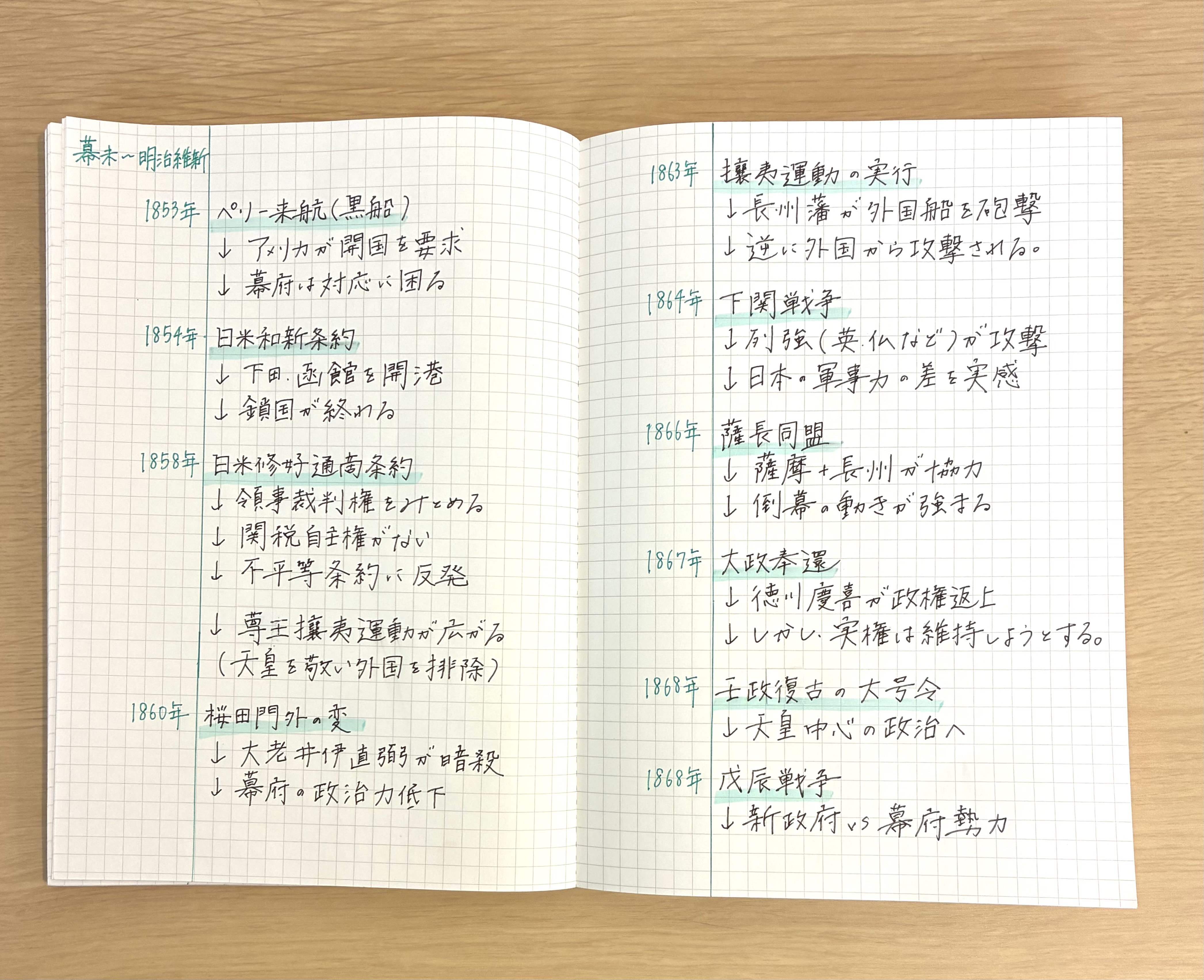 歴史の勉強は出来事の流れや時系列への理解が鍵を握るので、年表作成は有効な勉強術です。
